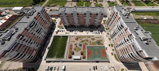 Преимущество этого жилого комплекса в необычном архитектурном строении придомовой территории — это двор на стилобате. Эта уникальная конструкция состоит из двух уровней: на верхнем расположена зона отдыха со спортивными и детскими площадками, с беседками и зоной барбекю, а на нижнем — крытая охраняемая автопарковка.