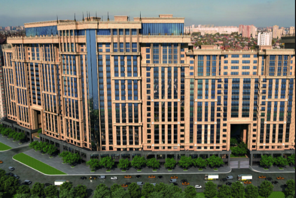 Застройка характеризуется отделкой фасада в стиле «неоклассицизм». На верхних этажах здания запланировано открытие фитнес-центра с бассейном. Снаружи дома планируется сделать панорамные лифты. Каждая квартира имеет окна в пол. Ряд вариантов оснащен собственными террасами.