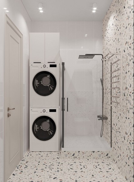 Квартира двумя полноценными санузлами. В одном установлена ванна, второй с душевой, место под стиральную машину и сушилку.