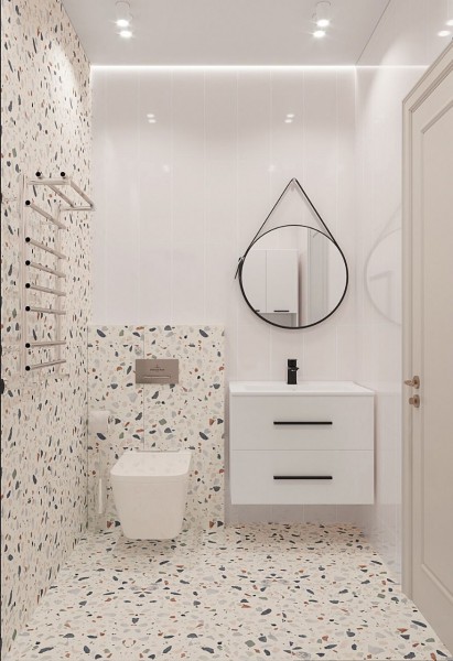 Стены подготовлены под покраску (можно выбрать нужный цвет) уложена плитка, установлена сантехника,