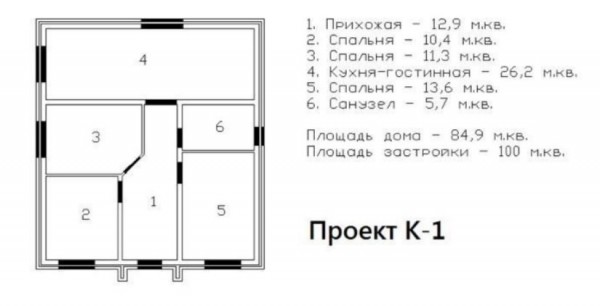 Три спальни 10,4+11,3+13,6 = 35,3 м2, и большая кухня-гостиная 26,2 м2.