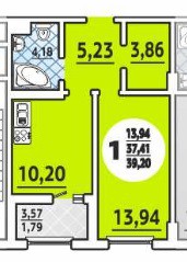 Жилая комната 13,94 м2 ,кухня 10,2 м2.