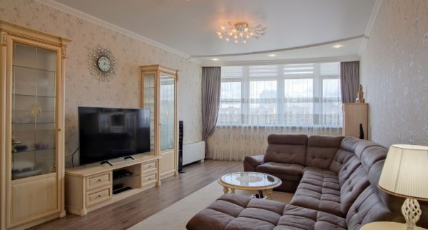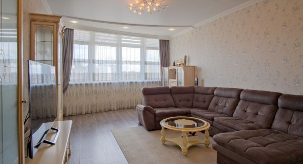 Квартиру площадью 133 кв.м. , состоящую из трех изолированных спален , двух санузлов , просторного зала , кухни с выходом на лоджию и прихожей .