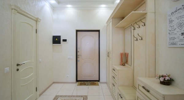 Прихожая оборудована мебельным гарнитуром и встроенной системой хранения.