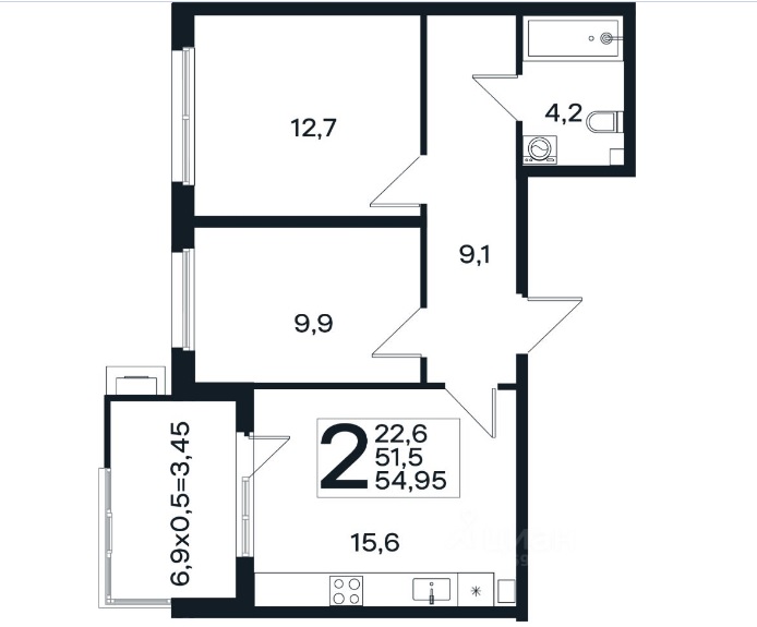 Двухкомнатная квартира 54,95 м2. Лучшая планировка: комнаты с правильной геометрией, большая кухня, огромная лоджия!!!