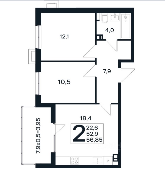 Двухкомнатная квартира 56,85 м2. Лучшая планировка: комнаты с правильной геометрией, большая кухня, огромная лоджия!!!