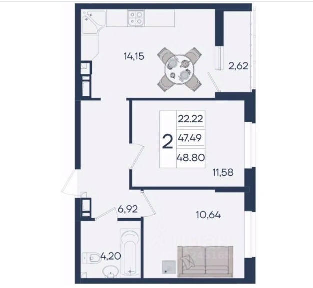 2 комнатная квартира 48,8 м², на 12 этаже в строящемся, жилом комплексе.