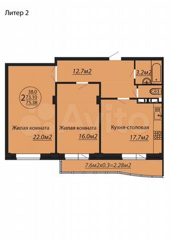 75 кв.м., 2 комн. квартира