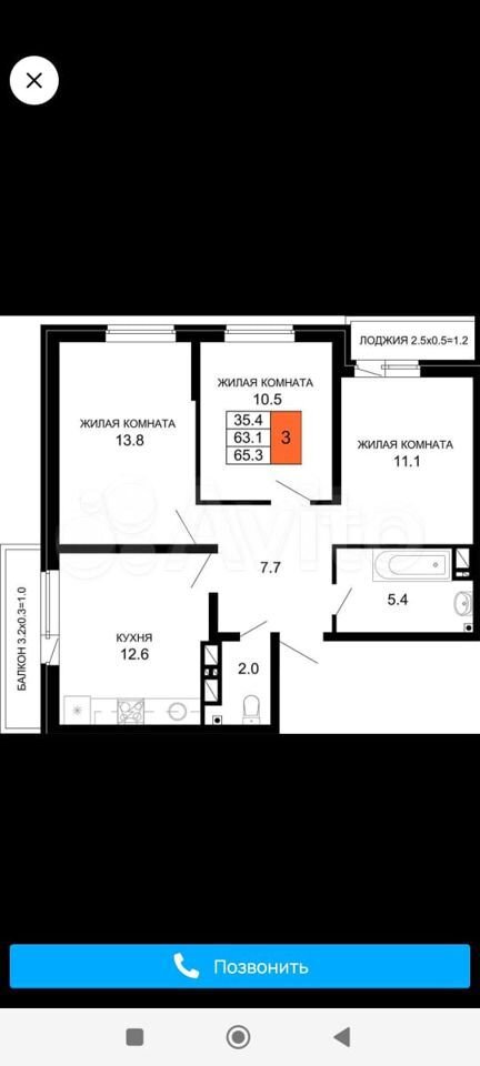 65 кв.м., 3 комн. квартира