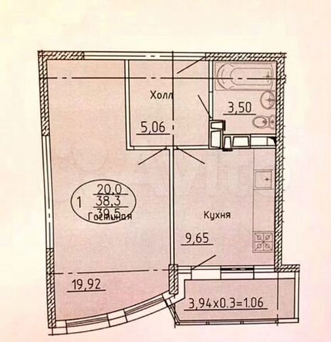40 кв.м., 1 комн. квартира