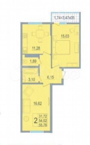 54 кв.м., 2 комн. квартира