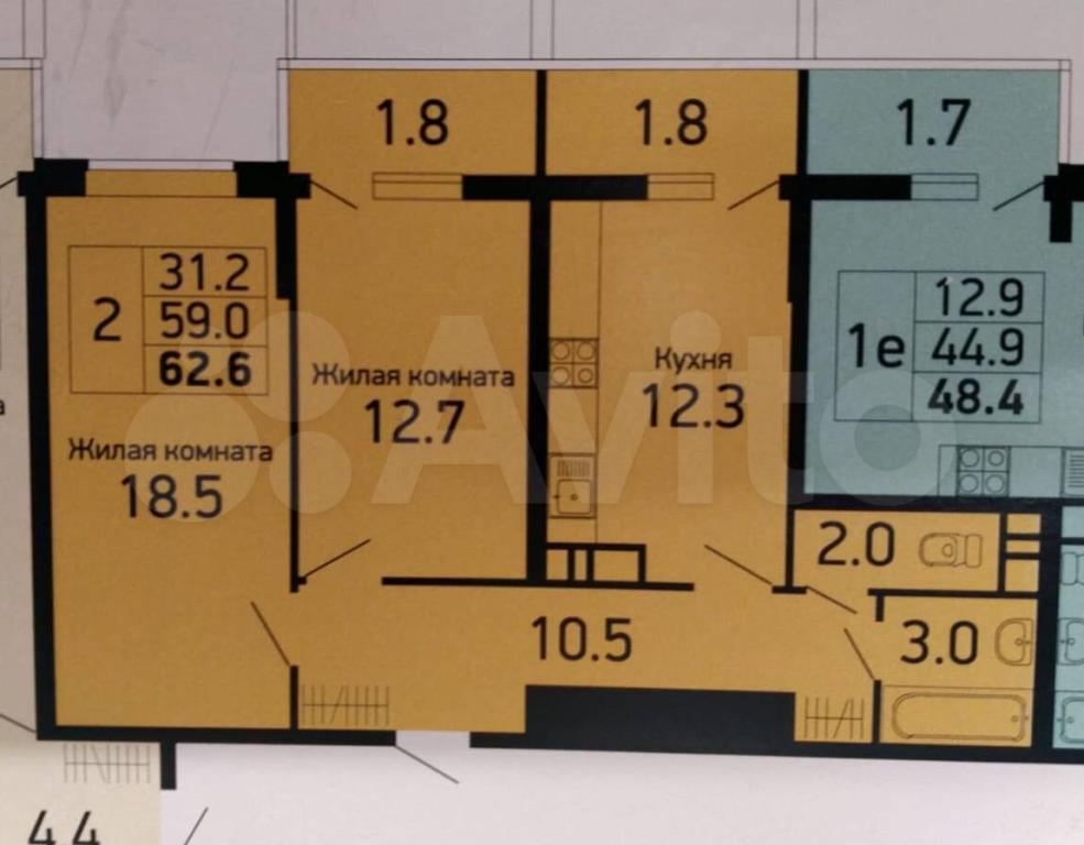62 кв.м., 2 комн. квартира