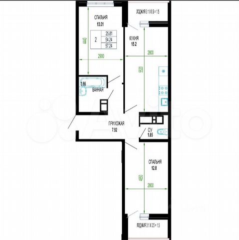 57 кв.м., 2 комн. квартира