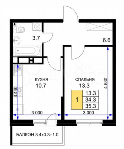 35 кв.м., 1 комн. квартира
