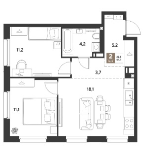 54 кв.м., 2 комн. квартира в новостройке