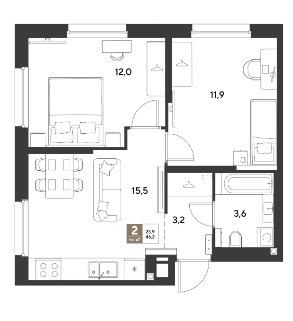 46 кв.м., 2 комн. квартира в новостройке